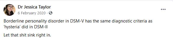 I don’t often think I’m going mad, because the concept has never made much sense to me but there you go. I do occasionally wonder if I’m drowning in a storm with my feet on dry land. I remember at the last feminist conference I went to, Dr Jessica Taylor telling us about ‘borderline personality disorder’, and how that would appear to be the establishment’s current best stab at explaining the state of women reacting to a lifetime of being used and abused.