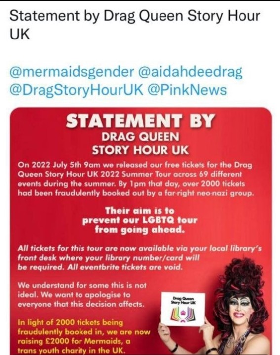 In the last couple of weeks, the most visible action women have taken to flag this up is their challenge to ‘drag-queen story hour’. The response of the organisers illuminates two very important issues. The first is the habitual claim that women’s actions come from ‘fascist’ or ‘far right’ organisations, the other is that their statement tag-ins and fund-raising choices demonstrate their connection with Mermaids, the organisation many of us suspect has been responsible for more transing of children than any other in the UK.