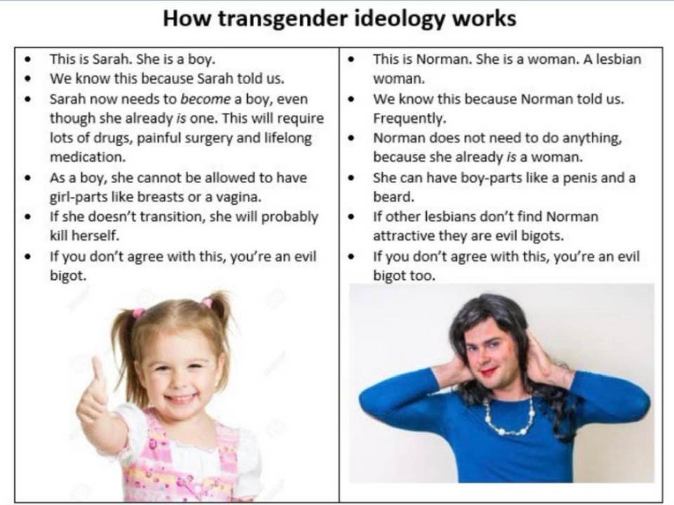 The crazy thing is that once you see the logic of it – that you can’t believe in, or approve of, single-sex orientation (that is, being gay or lesbian) if you’re also required to believe that males can be women and females can be men, that they must be believed, then you are going to have to tell gay and lesbian people that their natural predilections are mistaken and must be supressed.