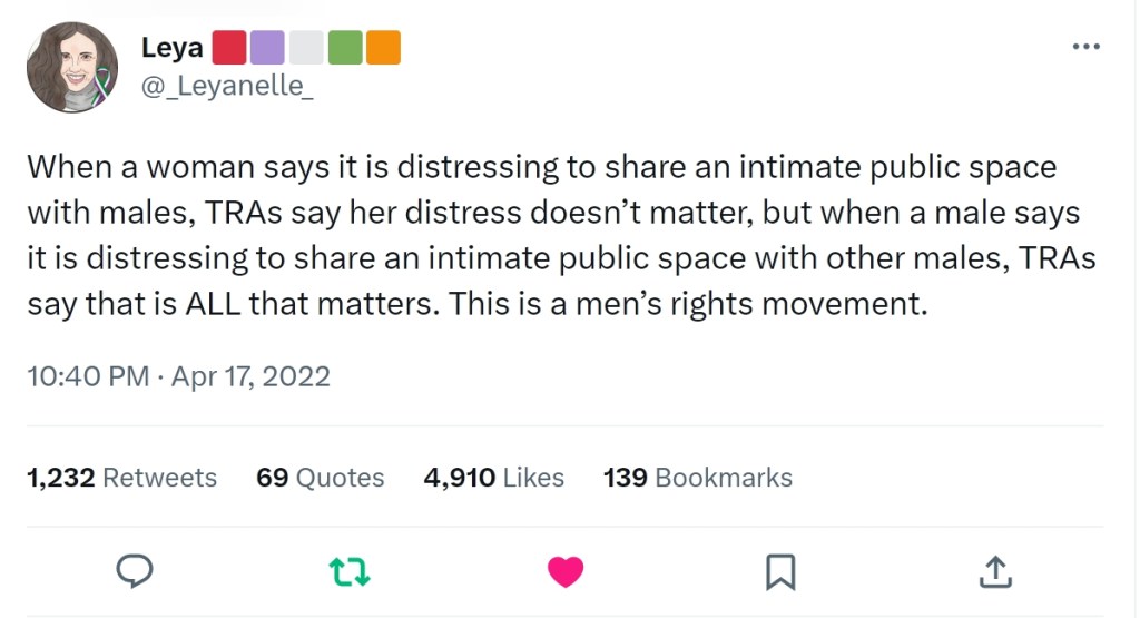Over time, we can solve this issue the same way we’re in the process of solving the toilets for people with disabilities issue. We build toilets that work for them. It takes time though, and while we’re waiting, life is hard on those who are affected. As someone who’s been through pregnancy and menopause, I know there are times when it’s a very urgent issue indeed. It would help if all concerned took the ‘am I making someone else anxious?’ line and acted on it, but we do need everyone to realize the anxiety that comes from breaking the social norms (females and males in separate facilities) is not just anxiety for women, it’s a real reaction to a real danger. Whatever other facilities organizations provide, it is a well documented fact that they can prevent most violence and abuse by having clearly labelled, separate loos and changing rooms that are only for females. Where they don’t do that, there are more cases of violence against women. QED.