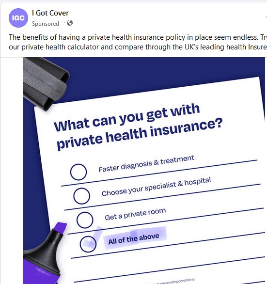 I knew we had councillors who were trying to improve GP access, so I thought the petition would add grist to their mill, but it went nowhere. I got talking to a few people I’d shared it with and found out why. People are afraid to criticize what’s left of our NHS, because they can see it’s fragile and under threat. They’re right, too. Any criticism of the NHS on social media tends to be closely followed by the appearance of an ad like this one…