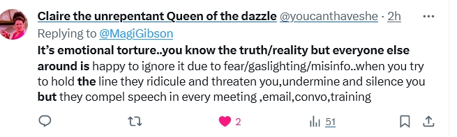 Unfortunately for us, all that bullying and marginalization that’s been going on has resulted in them being the only people who get heard in all those meetings in councils and trade unions, so you can go on telling yourself ‘gender critical feminism’ is a minority view.