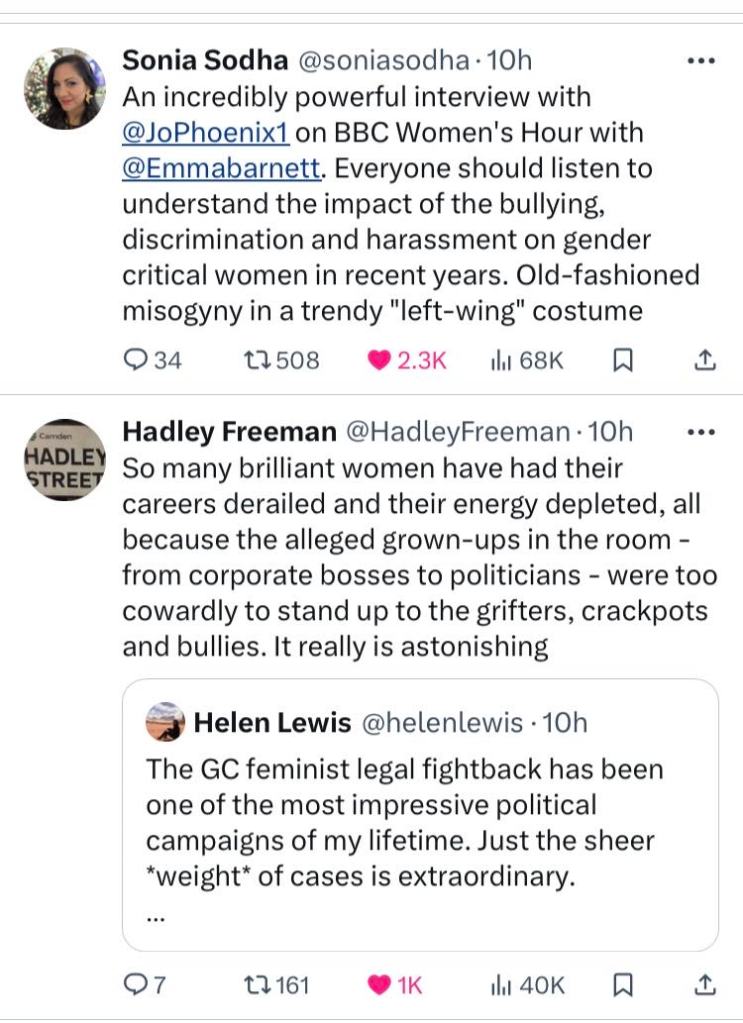 Here are some clips from the Jo Phoenix hearing, which confirmed again that it is illegal to discriminate against women for ‘gender critical beliefs’, to slander and marginalize them with ‘TERF’ and ‘transphobe’.