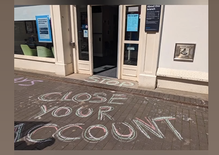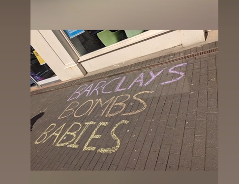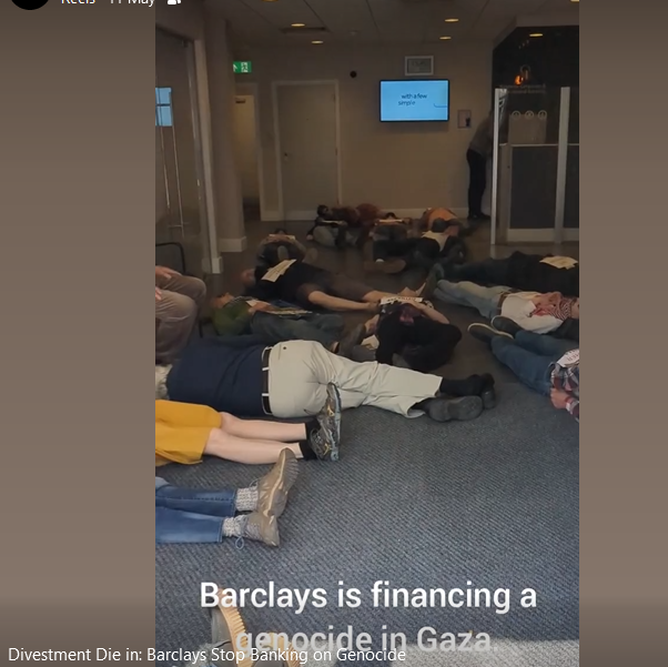 One of the actions announced at the gathering in Hastings this week was this die-in at Barclays, another huge source of funds for genocide.