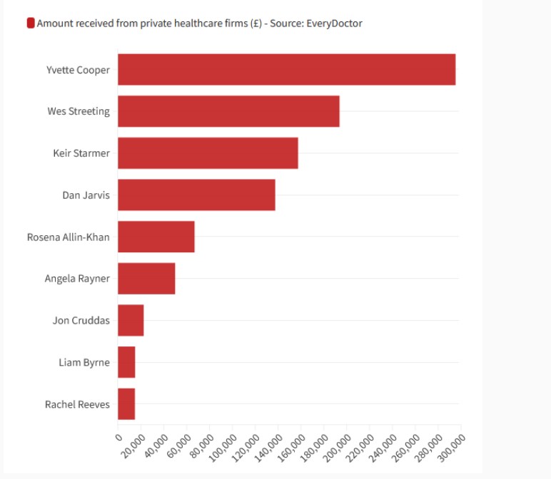As you can see, despite all the horrible, corrupt, cruel, dodgy-economy ideas Streeting and Kendall have been coming up with on health, Yvette Cooper is way ahead on receipts of private health “care” donations.