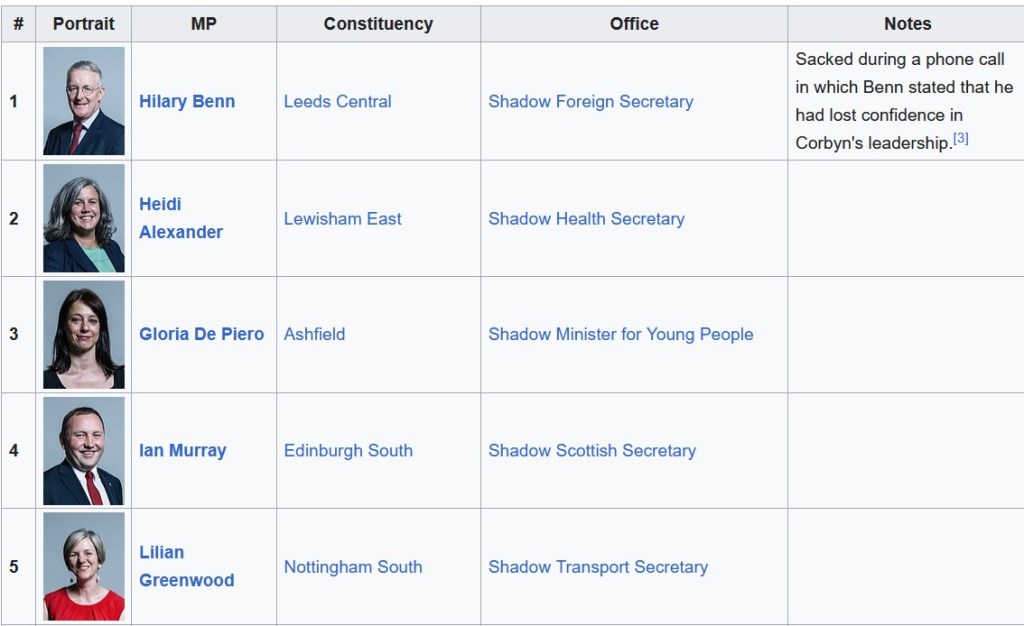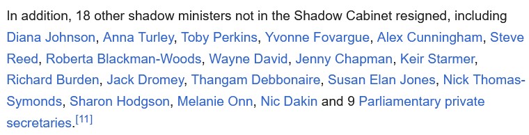 Cooper resigned after that leadership election, in which she came third. She didn’t even wait for “the chicken coup”. Here they are following Cooper’s lead. All of them demonstrated that they would rather step down than participate in a “better, kinder politics” (well, except Benn, who was sacked before he could get his resignation in.