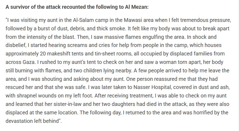 Al Mawasi has been attacked repeatedly — and those refugees — those Gazans who were sent to Al Mawasi because it was a ‘safe zone’? Those who are still alive have been moved on repeatedly, as Israel bombs their temporary homes, then tells them about yet another ‘safe zone’ they have to move to.