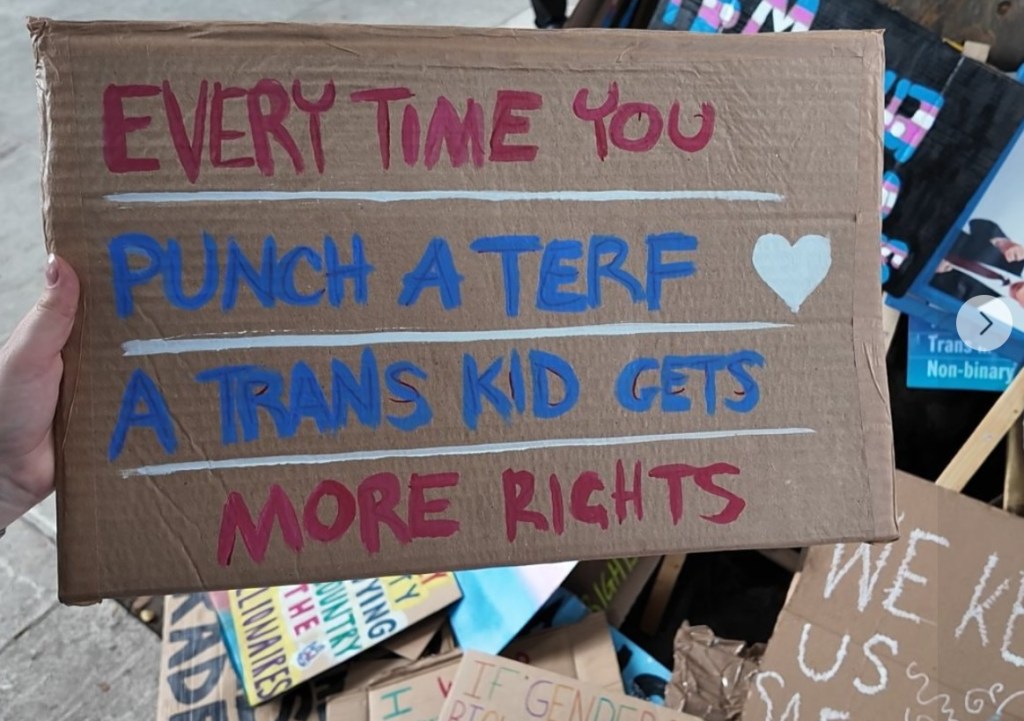 The photos I’ve laced this article with are not of ‘trans people’, they are of ‘the trans rights movement’ as expressed by London Trans Pride this summer. That is the movement that gains traction whenever a politician makes a vague statement about being ‘pro-trans’, without affirming women’s sex-based rights. The ‘trans rights’ movement is violent, it is divisive, it is misogynistic and it is driving women away from the socialist movement we all need. It is not remotely in line with what British people want.
