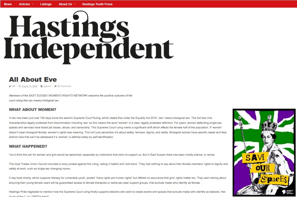 On August 12th 2025, Hastings’ local, volunteer-run community newspaper included a feature by the local Women’s Rights Network that set out the views of the women’s rights campaign following the Judicial Review of UK Equality law.