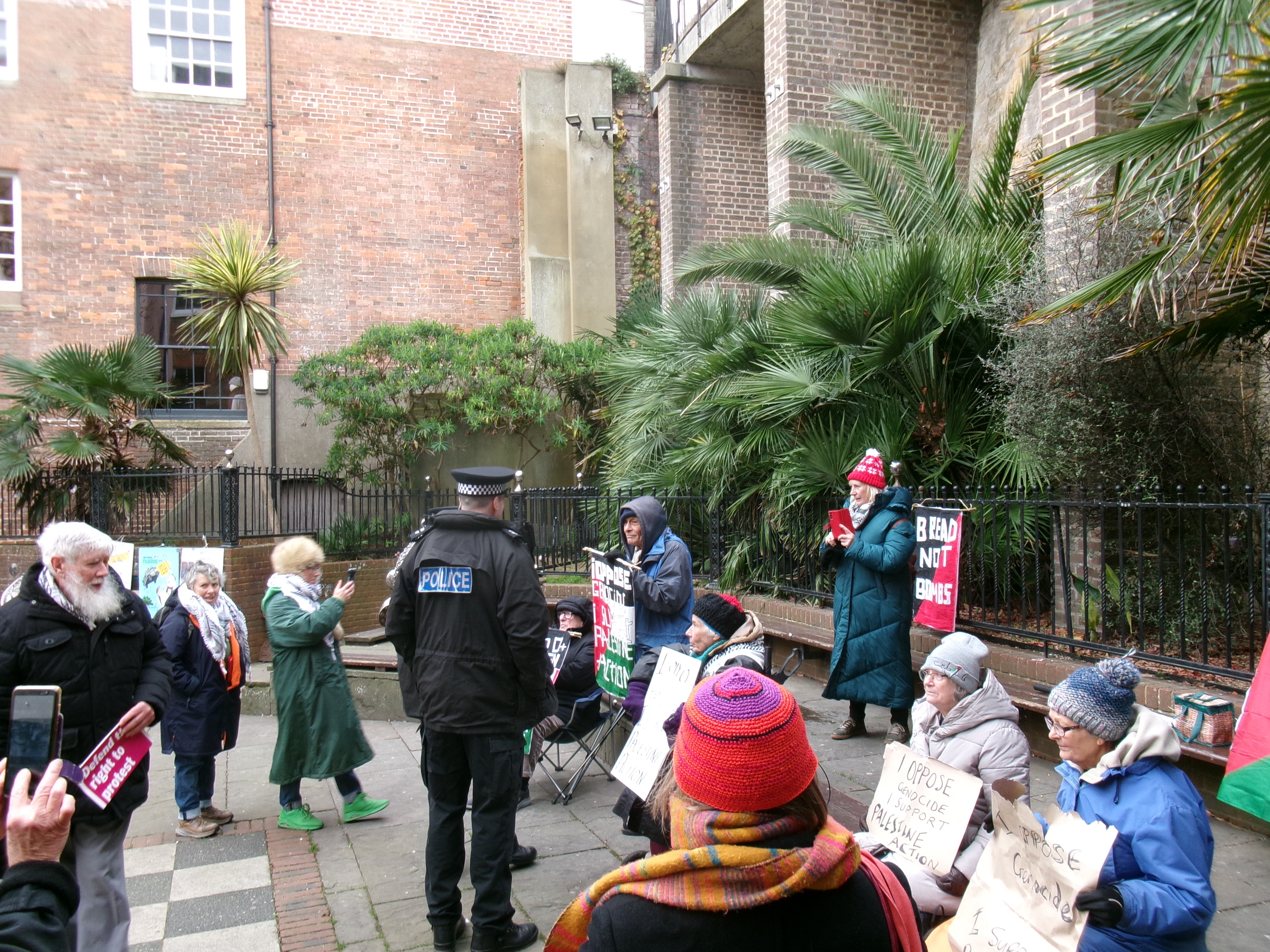 This weekend saw protests like these all over the UK – five of our own in Hastings were arrested. Our local activists have been on pretty friendly terms with Hastings police, especially those who have taken part in anti-war marches and gatherings in Hastings for years. But this weekend, their long-held anti-war, anti-violence views brought them up against the police in a new and unwelcome way. You can see it was a sobering experience for these two.