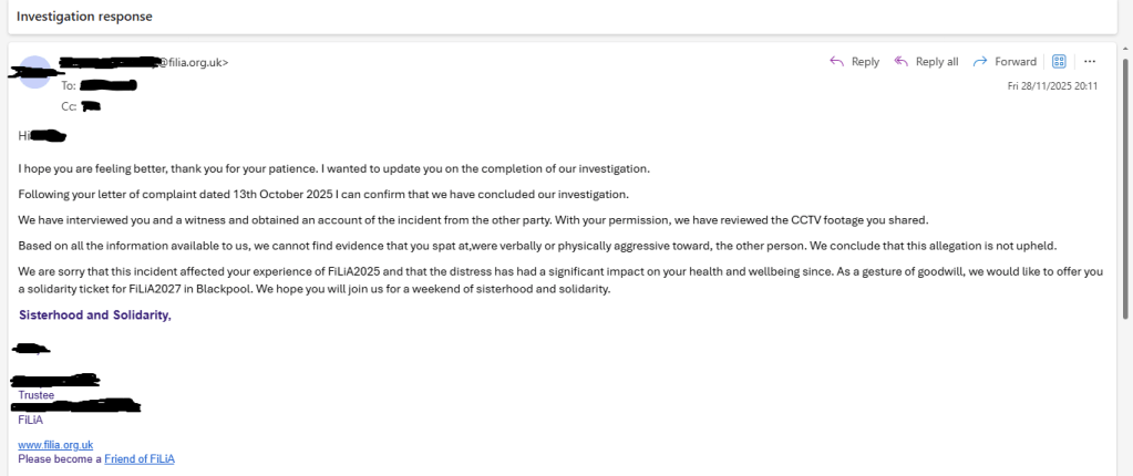 The victim of this false allegation therefore wishes to publicly share the results of the Filia investigation into this incident, which exonerate her. Filia were made aware of the intention to publicise the below communication in order to set the public record straight, and raised no objection.