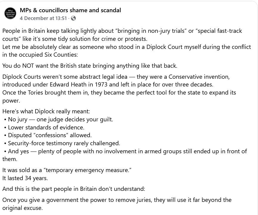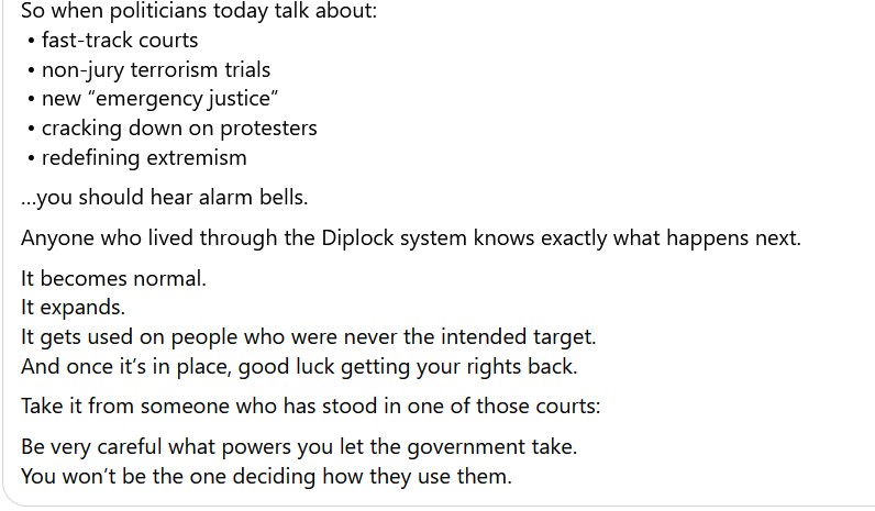 There is though, a far, far more important factor to consider at this time. Why do governments get into a place where they want to close down protest, or where they daren’t trust a bunch of random citizens to judge cases? If we stand outside our long-held habit of thinking we live in one of the sensible countries, if we think about those things the way we think about authoritarian governments in other countries, we should be turning hard back on David Lammy and saying why don’t you want people to speak their minds about Palestine, why are you afraid of letting random citizens judge cases?