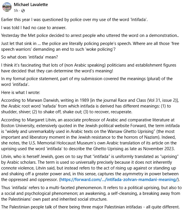 Actually, that’s precisely why the Met don’t like it. A widespread civil rebellion (which is what intifada actually means) is far more dangerous to an authoritarian government than actual terrorists (which is what they like to pretend protesters are).