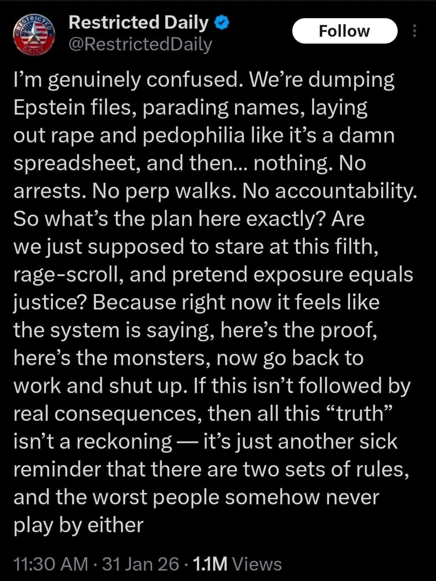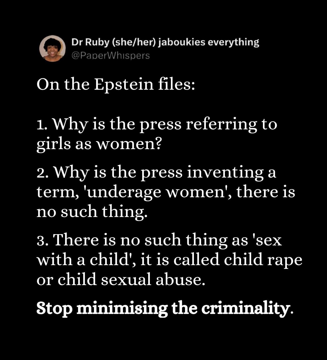 #metoo woke a lot of people up over sexism, and Black Lives Matter did the same for racism. In the UK, the Corbyn movement aided by the assemblies movement had started to improve class awareness. We are getting better at this. Caitlin Johnston said nothing will change, she said, ‘all that will come out of the Epstein releases is a few more people opening their eyes.’ Sure, but that’s what we need. It takes time. The struggle goes on.