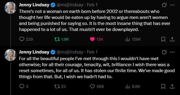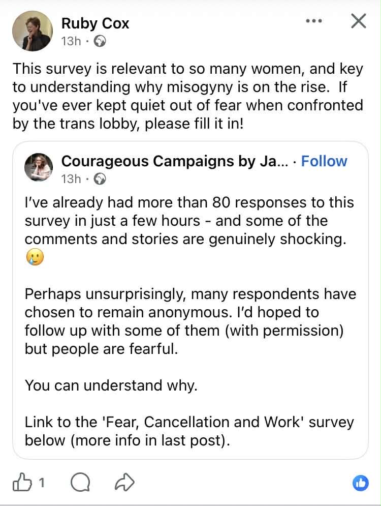 … there are also a lot more people now who recognise comments like that as a woman obediently passing on classic misogyny. There are even some who recognise the bullying and cancel-culture around the women’s rights campaign as a gleeful attack on disobedient women. Even better, we’re beginning to see some moves now to help the vast numbers of women who’ve been materially knocked back as a result of ‘saying something’ about the trans v women’s rights situation.