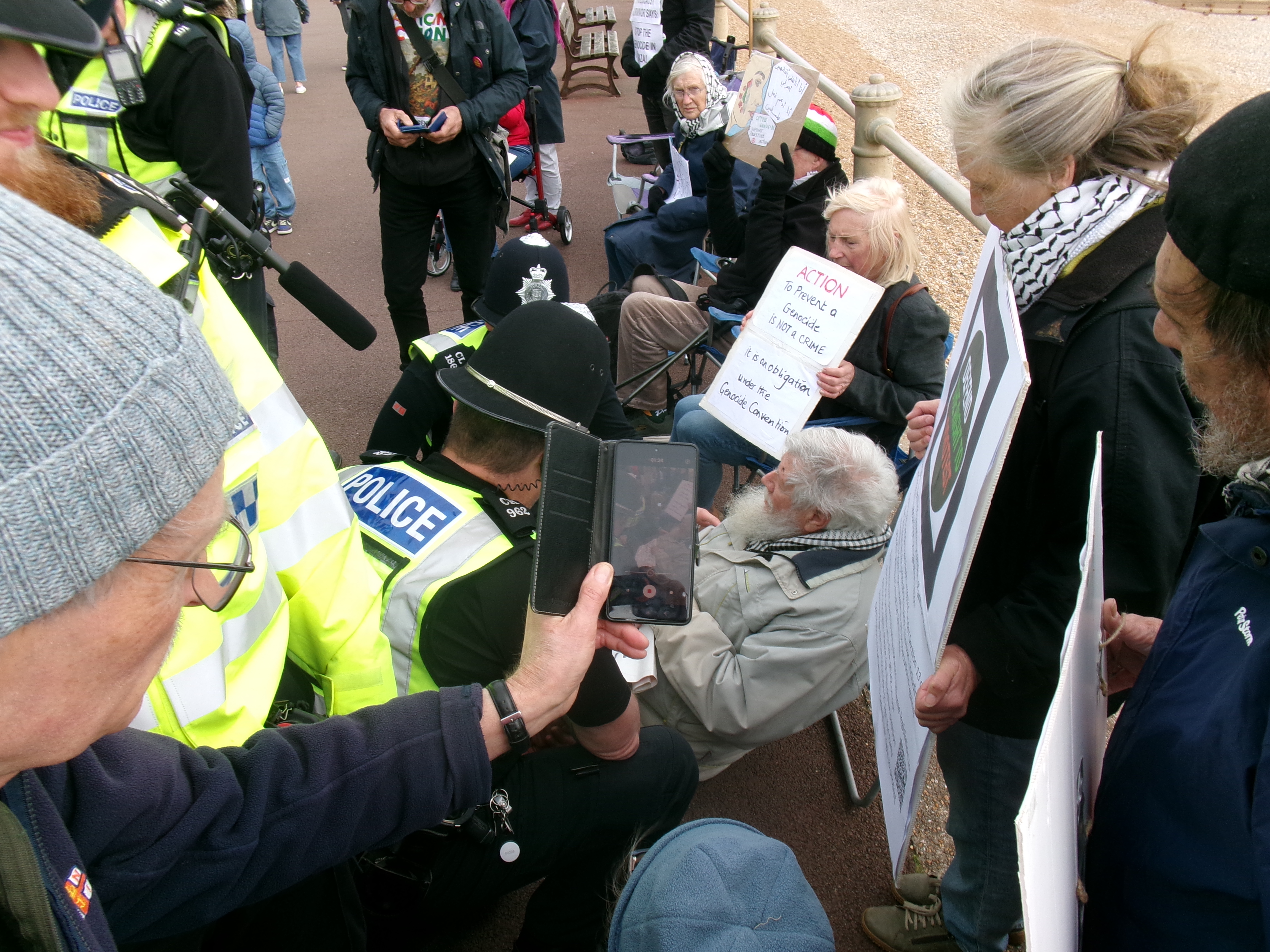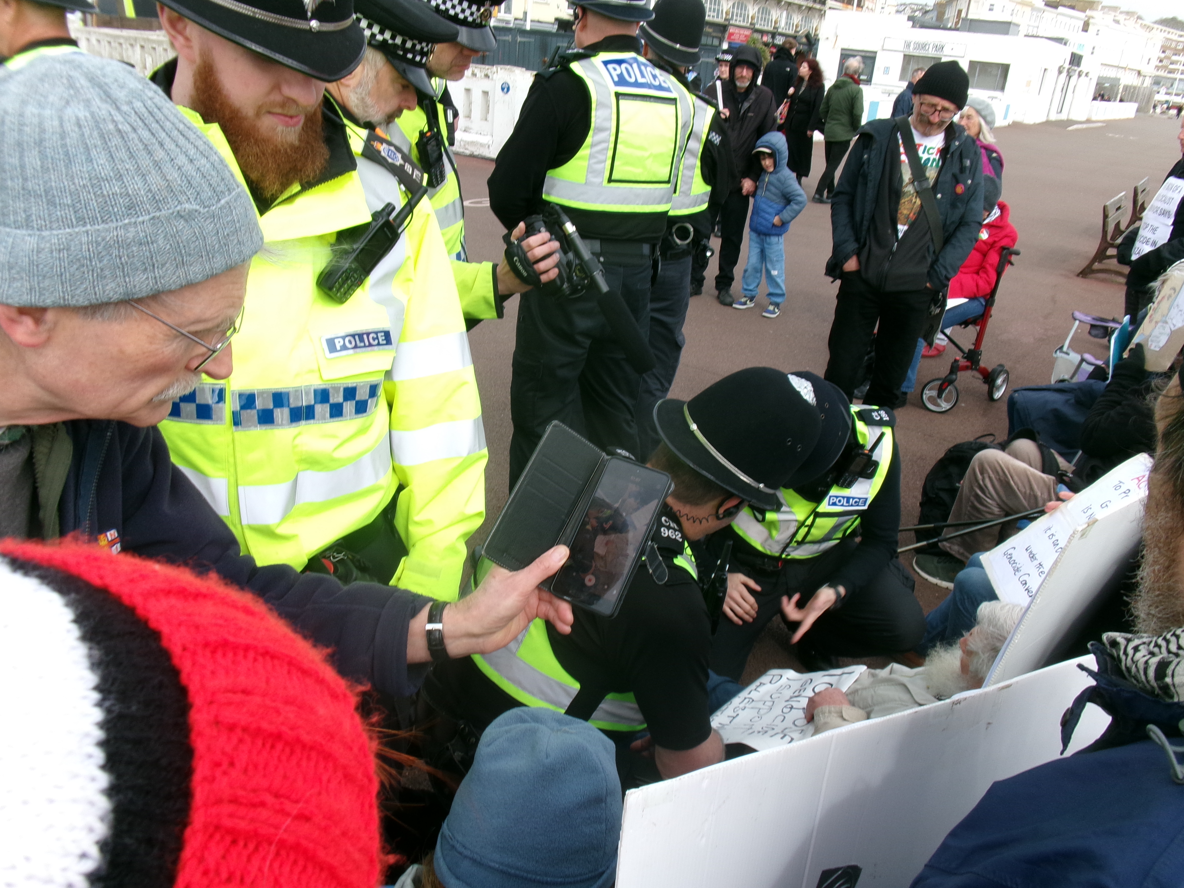 The people who gathered to protest, or to witness the protest, were very upset to see it come to this. The organisers, protesters and witnesses were calm and peaceful throughout — but I did notice quite a few passers by were vocally angry — angry at the police, and at the government, that our country has sunk to such a level. Most people though, were calmly supportive, drivers tooting in salute, dog-walkers smiling silent approval, and a few people slipping money to the protesters – I’m told this has become a custom with these protests, because some police forces dump the people they’ve arrested quite far from home, and often late at night. The supporters are making sure they have their fare home.